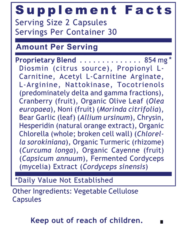 Diosmin (citrus source), Propionyl LCarnitine, Acetyl L-Carnitine Arginate, L-Arginine, Nattokinase, Tocotrienols (predominately delta and gamma fractions), Cranberry (fruit), Olive Leaf (Olea europaea), Noni (fruit) (Morinda citrifolia), Bear Garlic (leaf) (Allium ursinum), Chrysin, Hesperidin (natural orange extract), Organic Chlorella (whole; broken cell wall) (Chlorella sorokiniana), Organic Turmeric (rhizome) (Curcuma longa), Organic Cayenne (fruit) (Capsicum annuum), Fermented Cordyceps (mycelia) Extract (Cordyceps sinensis)